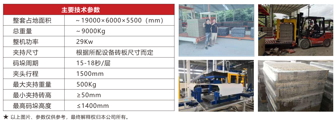 整套系統采用PLC+觸摸屏控制,配合智能傳感器,實現無人自動化運行,出現故障自動停機報警并顯示故障位 置,無需專業技術人員就可輕松排除故障,設備運行采用電、氣、液分別控制,互不干擾、動作連貫,約16s左右可碼 一層,班碼磚量約2000板,配套叉車抱夾可實現無托盤轉運,裝車。