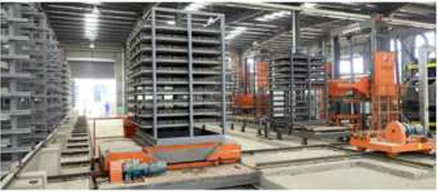 本生產線預制成型的濕磚由升板機將其提升放置在鐵架之上每一層磚板相互隔離,放滿之后可用又車將整個鐵架轉移至養護區,也可配套新能源智能子母車將其轉運至養護窯內進行養護。